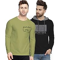 BULLMER Mens Printed Hooded & Round Neck Cotton Tshirt - Pack of 2