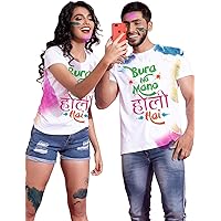 SMILEYO Holi Combo T-Shirt **BURA NA Mano Holi HAI** Printed Round Neck & Half Sleeve White Customized/Dry-Fit/T-Shirt for Couple/Men/Women | Holi Couple T-Shirts